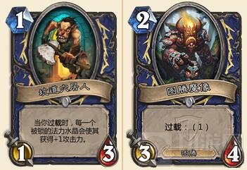 穴居人+图腾魔像:这是萨满的传统强势组合,依靠这个组合我们能够在前期获得比较大的优势,如果顺利的话也能在前期占到很多血量的便宜。虽然我们在过载上并没有太多,只有图腾魔像和闪电箭这两张过载的卡牌,但是在实际对战中穴居人给予对手的压力是很大的,一般情况下对方都会尽量去解场。图腾魔像呢,是目前2费最强的存在,在天梯中面对任何职业都是巨大的威胁。