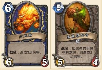 腐蚀者+火爹:两个规格的火爹,在解场和进攻输出上都是不错的选择。之前我们考虑过深渊魔像,一般情况下深渊魔像能够降低到4点费用,但是这种情况下属于一种被动的防守。相比于本来就略微依靠随从而有些被动的龙萨来说,我们需要一些主动进攻的能力,并且弥补一些过场伤害不足的情况,所以经过实践我们带上了双火爹,双黑翼。这样我们相比于战士没有斩杀、没有冲锋。但是我们拥有更多的可选择性伤害。在实际的使用过程中也获得了不错的效果。