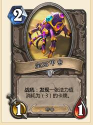 宝石甲虫:这张卡牌算是强行加进去的,因为我们在过牌上有一些缺陷,只有蓝龙的两张过牌,而没有带马桶。所以外挂了一个馆长。如果单独用馆长去过一张龙类卡组,那么也是亏本的买卖。因此我们就带上宝石甲虫。3费对于萨满来说是一个很不错的选择费用,有大解呱、有AOE闪电风暴、元素毁灭、有嘲讽狼魂、有恢复治疗波。这样看来宝石甲虫反而是一个不错的选择。