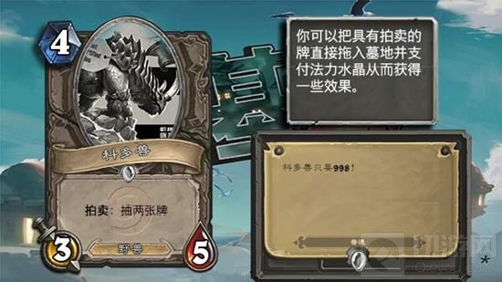 这张牌的意思是,如果你直接把它拖入战场,那么就是一张4费3/5的白板野兽,但是你还可以将它直接送进墓地,虽然你仍然需要支付4点费用,但是你却可以获得拍卖带来的效果,在这里是4费抽两张牌。这种机制有一点像是抉择,但是比抉择的好处在于,具有拍卖的随从可以理解为是一张兼具随从与法术的牌。