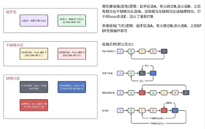 注意:长轴主要需要看精元够不够,够打火拳爆发轴,不够转扇子追击骑龙轴;打爆发轴时还需要看boss火有没有断,火没了需要续火;如果有别人吐火就省略吐火步骤直接打火拳轴。嗯非常灵活多变的一个流派呀()