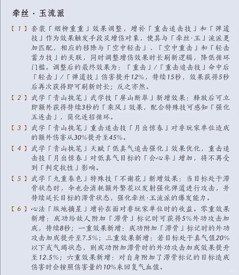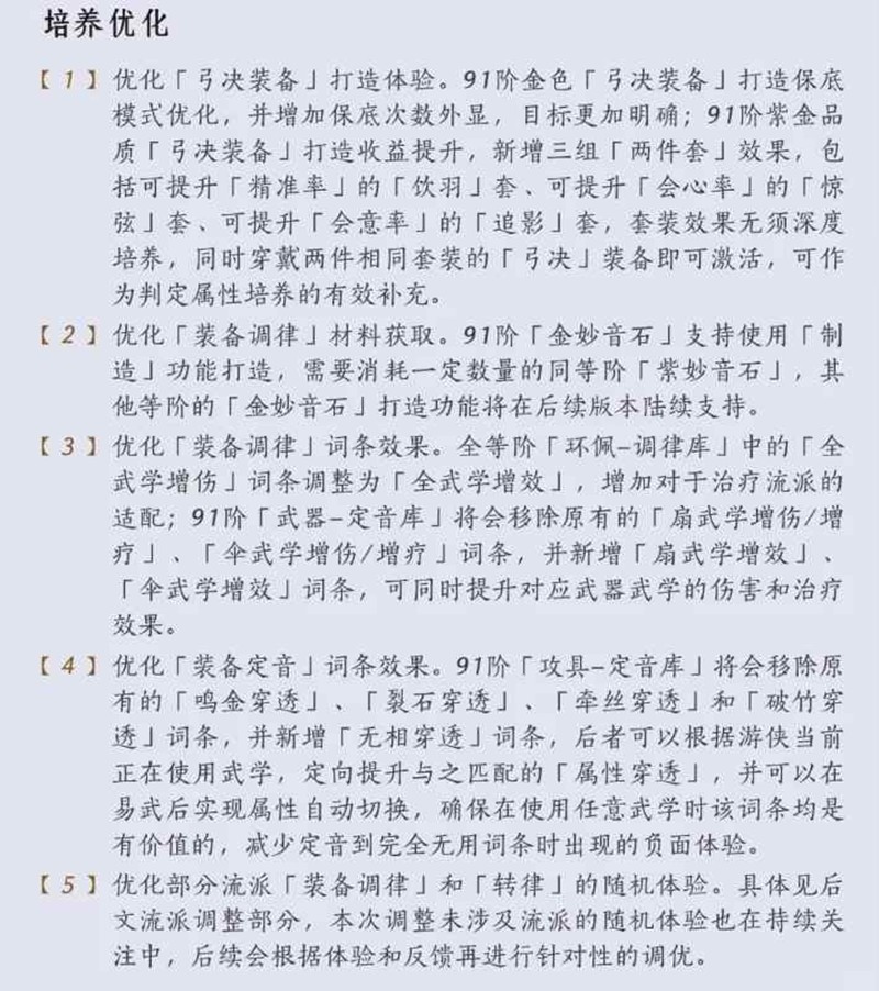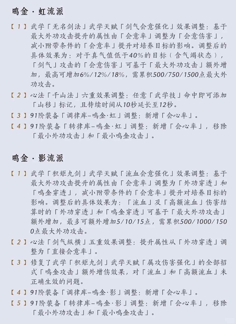 重点更新:移除了会意软上限,且降低了天赋与会意的强绑定关系。流血伤害可以吃到更多的鸣金加成,双穿增加,会心收益提高,转律库优化。