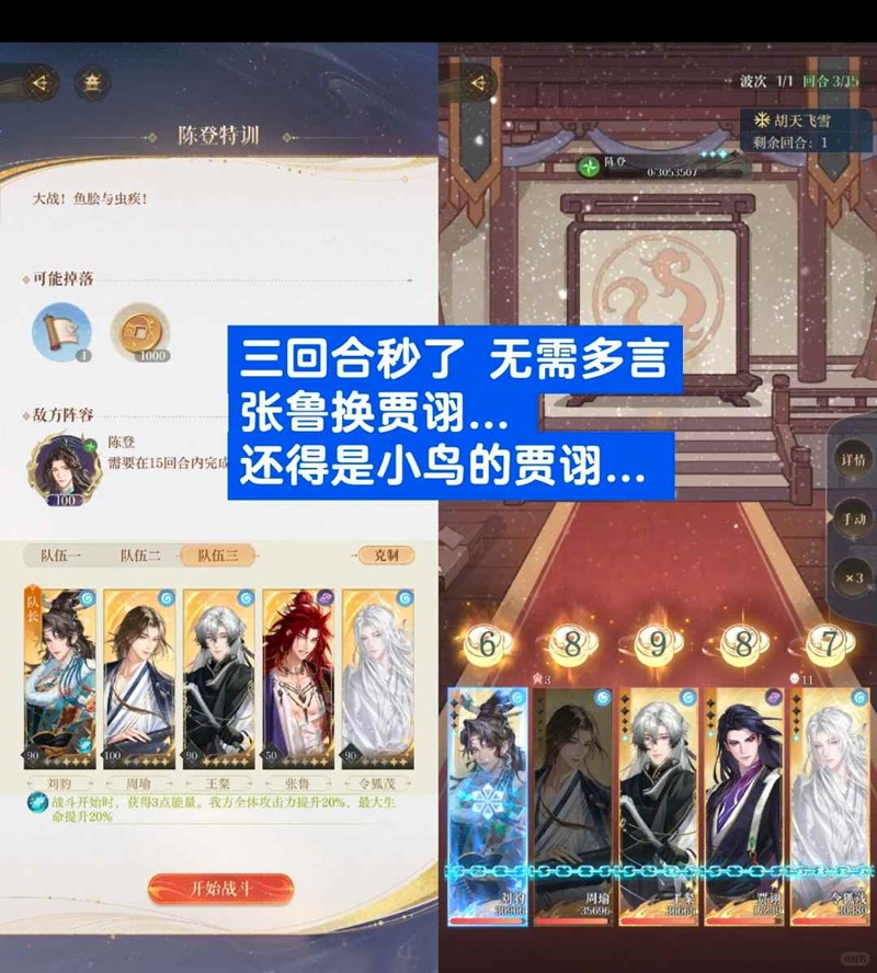 【陈登特训下】:小改版贾诩3回合秒了,用张鲁我的伤害不够。如果秒不了,就得上多次攻击打金币了。