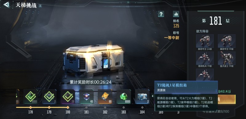 参与天梯挑战每突破5层就能获得1个T2模组箱。当达到99层后,每5层奖励会提升至2个模组箱。这种获取方式虽然需要持续挑战,但能够长期稳定地积累模组资源。