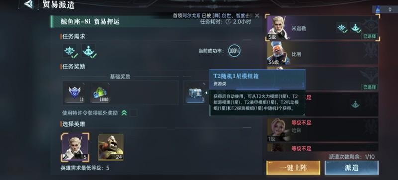 每日最多可以产出28个T2模组箱。玩家需要派遣舰队完成贸易任务,使用贸易特许令能够提高任务成功率。单次派遣最多可获得4个模组,这是稳定获取模组的重要途径之一。