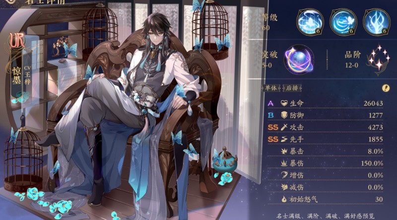 惊墨虽然定位为后排输出,但由于初始怒气值高达30点,更适合放在前排先手攻击。他的千蝶引技能不仅能造成高额普攻伤害,还能降低敌人防御,在实战中展现出惊人的强度。