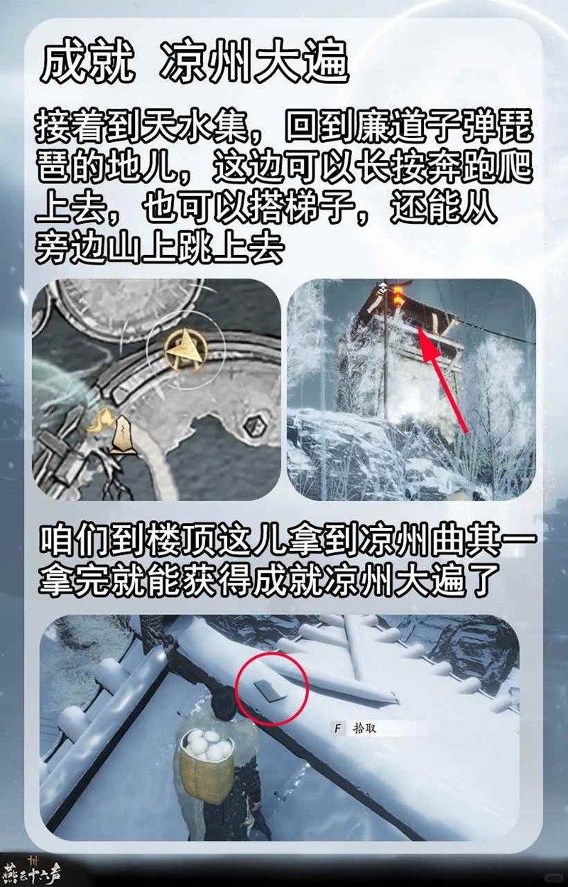 接着俺们传送到天水集,回到廉道子弹琵琶的地儿,这边可以长按奔跑爬墙上去,也可以搭梯子,还可以从旁边山上跳上去。咱们到楼顶廉道子弹琵琶这儿拿到凉州曲其一,拿完就能获得成就凉州大遍了。