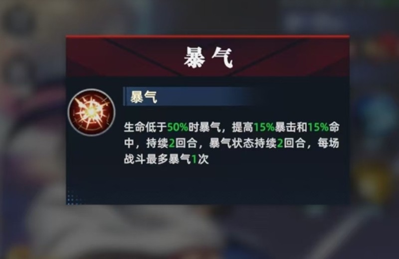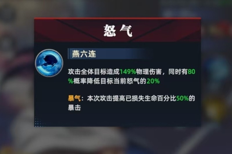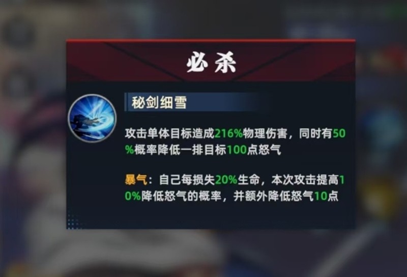 橘右京的怒气技能”细雪”能攻击全体敌人,80%概率降低目标当前20%怒气。在爆气状态下,该技能会根据损失生命值的50%提升暴击率。当生命值低于50%时,爆气状态还能提供15%暴击率和15%命中率加成,持续两回合。这使得橘右京在残血时反而能爆发出更强的战斗力。