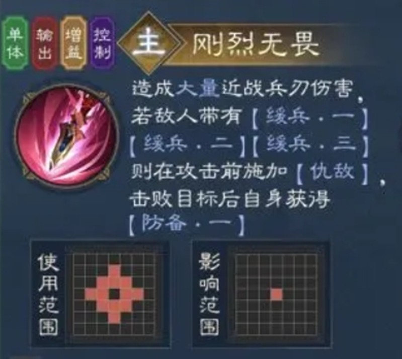 这是一个多功能技能,可造成大量伤害的同时施加仇敌印记。若目标带有缓兵状态,还能触发额外效果。击败敌人后,夏侯惇会获得20%兵刃减免的防备状态,大幅提升生存能力。