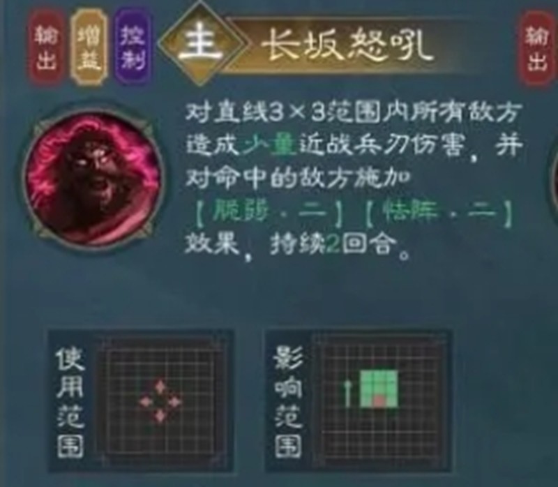 主动技能长坂怒吼能对直线3×3范围造成近战兵刃伤害,并施加脆弱和怯阵两种负面效果。脆弱降低敌方30%防御,怯阵减少15%暴击抗性,持续2回合。另一个注定技能万军取首可造成大量单体伤害,同时恢复自身生命值。