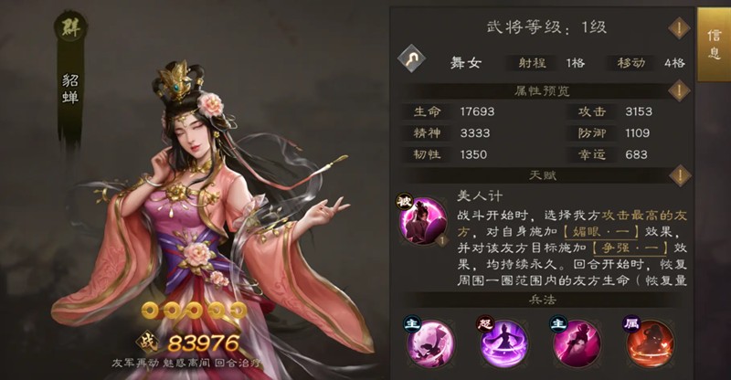 貂蝉作为辅助型武将拥有独特的再行动技能,可以让队友获得额外的行动机会。在战棋模式中,这个技能能显著提升队伍的机动性和输出效率,是非常珍贵的支援角色。