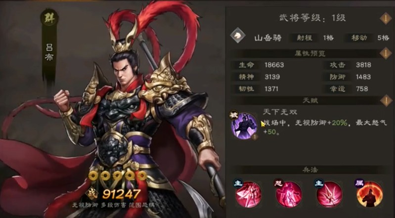 吕布是群雄武将中的顶级战力,作为力量型武将拥有超高的攻击范围和暴击率。他的五维属性十分优秀,特别适合使用方天画戟这类强力武器。不过需要注意的是,吕布的智力值较低,在面对策略攻击时比较吃亏。