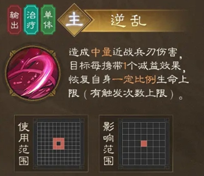 逆乱是董卓的第一个主动技能,既能造成中量兵刃伤害又能根据目标减益数量恢复自身生命。虐衅天下则是范围嘲讽技能,能吸引周围2圈内敌人攻击自己,减益效果越多嘲讽成功率越高。释放后还会获得持续3回合的虐衅效果。