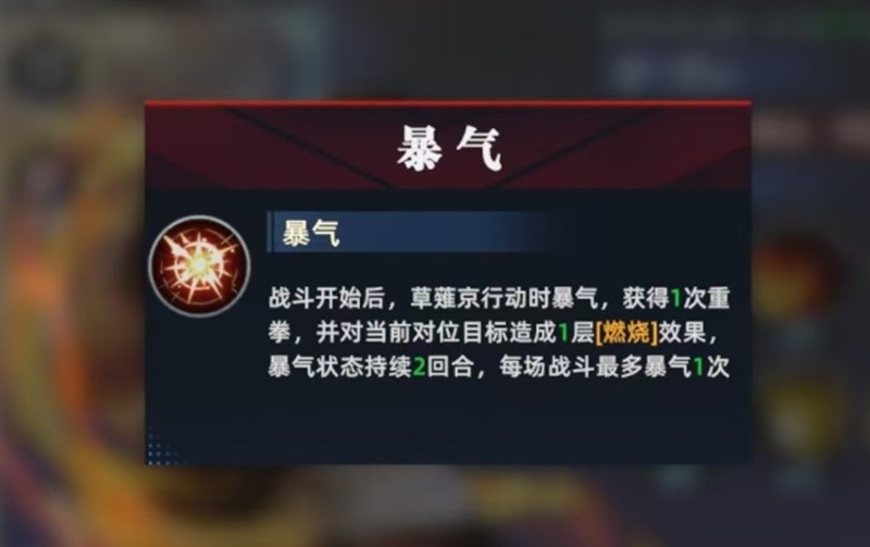 草薙京在全明星觉醒中定位为火系输出核心,战斗开局就能获得600点额外怒气。这种独特的怒气机制让他能在第一回合快速释放技能,配合爆气状态带来的两回合强化效果,能对敌方前排造成毁灭性打击。他的普攻”百式·鬼烧”自带25%概率附加燃烧状态,持续两回合每回合造成攻击力60%的伤害。